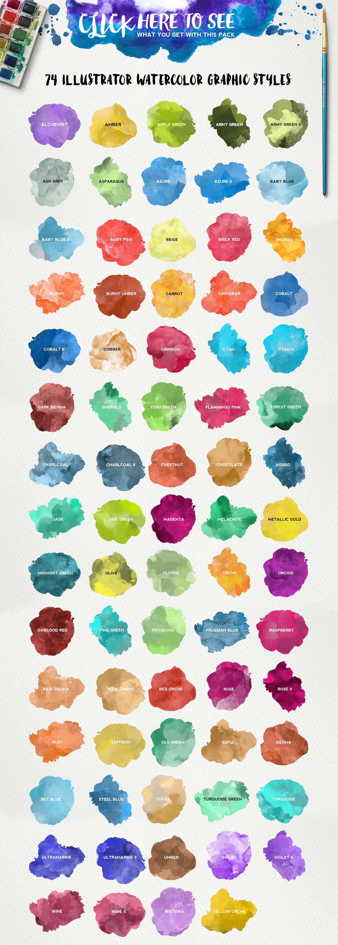 Watercolor Ultimate KIT is a set of hand-made watercolor ILLUSTRATOR STYLES, WATERCOLOR TO VECTOR ACTION and HQ PNG SHAPES to made unique watercolor 100% vector effects easy.