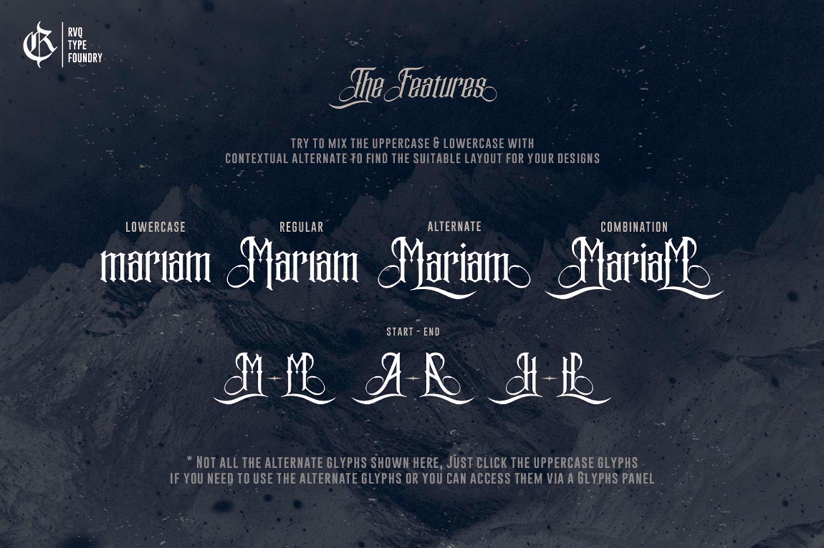 The mariam story is new font from Rvq Typefoundry, new black letter font elegant and vintage feel character set. To create the beautiful combination, just mix the uppercase and lowercase then mix with the alternative glyphs.