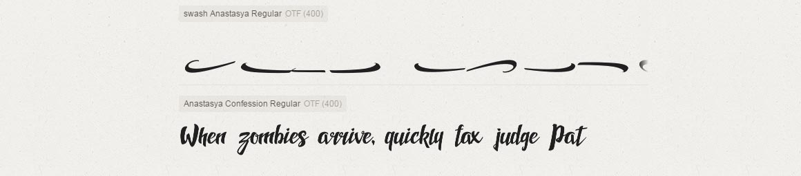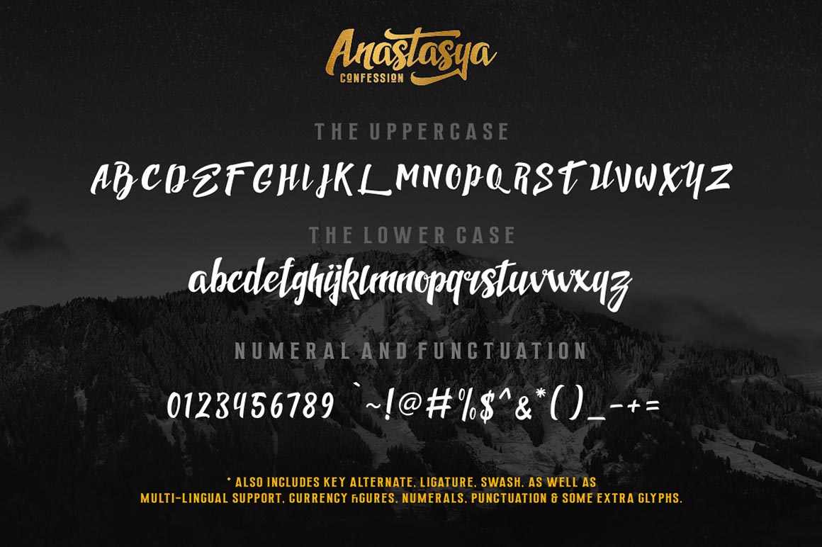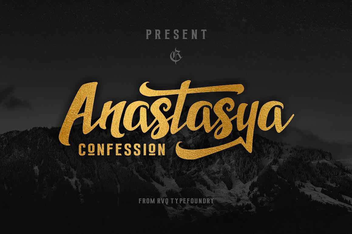Anastasya Confession is new font from Rvq Typefoundry, new typeface with classy, elegant and vintage feel character set. To create the beautiful combination, just mix the uppercase and lowercase then mix with the alternative glyphs and playing with swash. The Anastasya Confession includes a full set of capital and lowercase letters, as well as multi-lingual support, currency figures, numerals, punctuation & some extra glyphs.