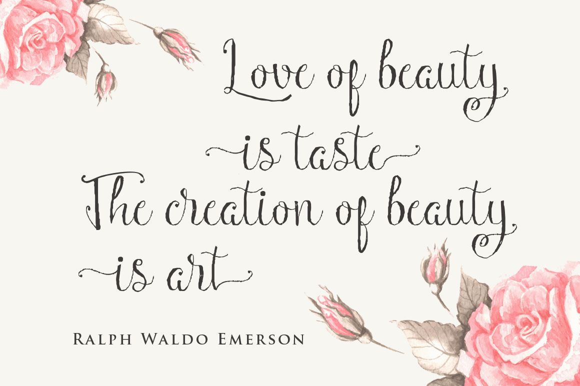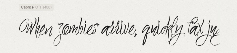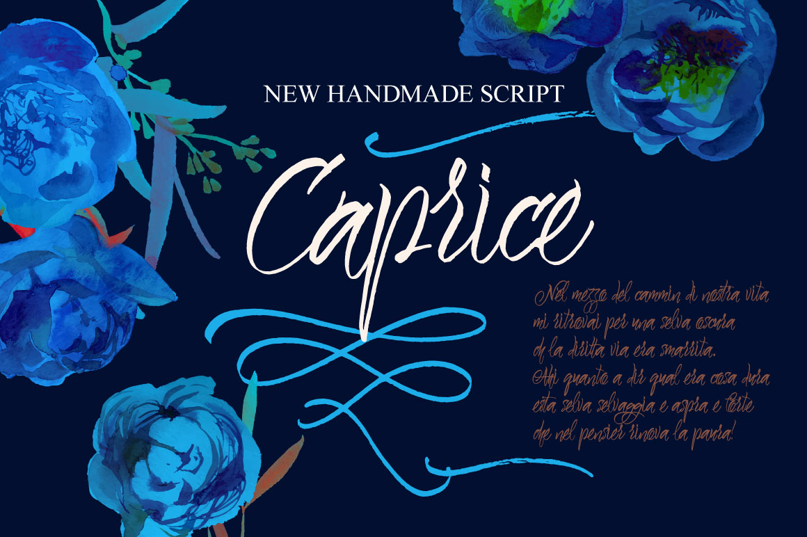 Caprice is a script with perky nature. Feminine and elegant. Great for posters, book covers… Features: Basic Latin A-Z and a-z, Numbers, Limited Symbols, Basic ligatures, Bonus EPS and jpg for flowers and swashes.