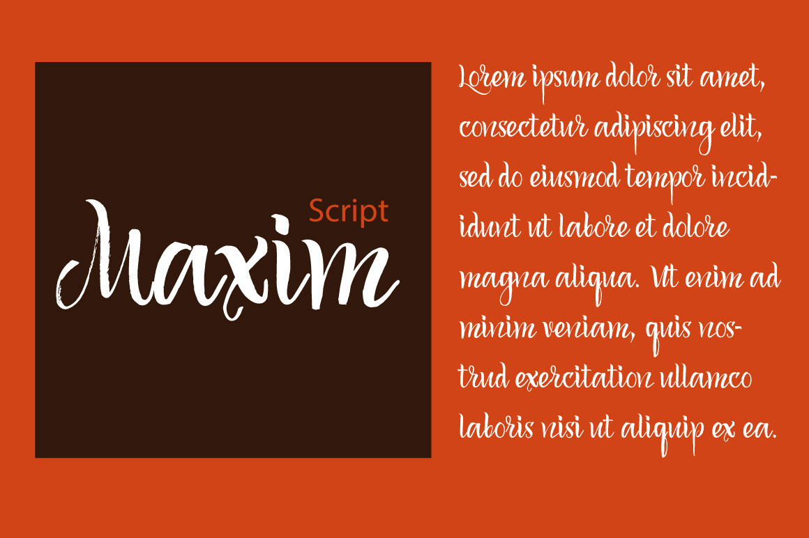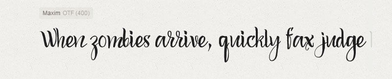 Maxim is a beautiful and rhythmic script with easy cheerful nature. Great for posters, greeting cards, wedding invitations, recipe cards, menu design and so on. Features: Basic Latin A-Z and a-z, Numbers, Limited Symbols.