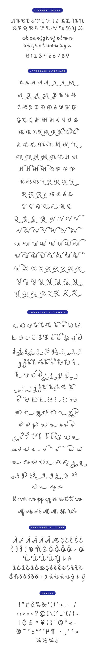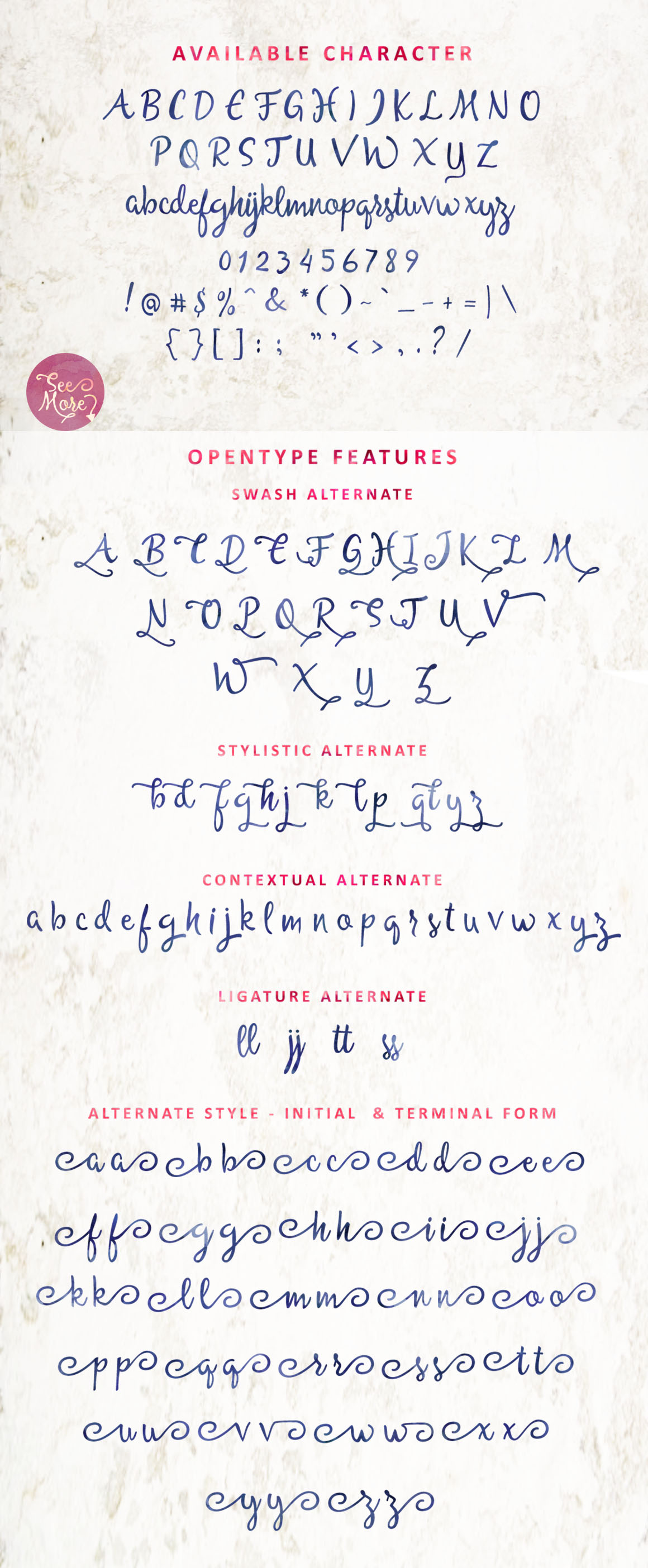 Allessa Script is a beautiful handmade script give the natural looks. 312 glyphs and alternate character contain with opentype features. Stylistic alternates, Ligature, Swash and more. You can access all those alternate characters by using OpenType savvy programs such as Adobe Illustrator and Adobe InDesign. Great for Apparel Brand, any greeting cards, book cover, Painting design style, or any design that needs natural and personal touch. Mix and match the alternate characters to add an attractive message to your design.