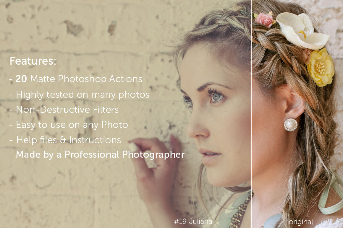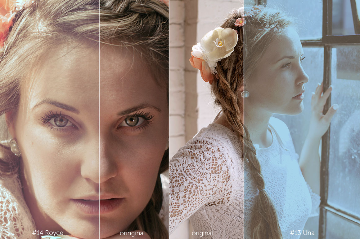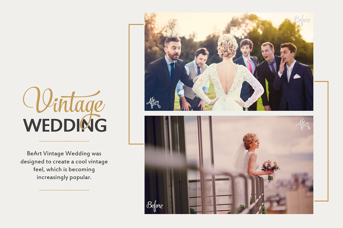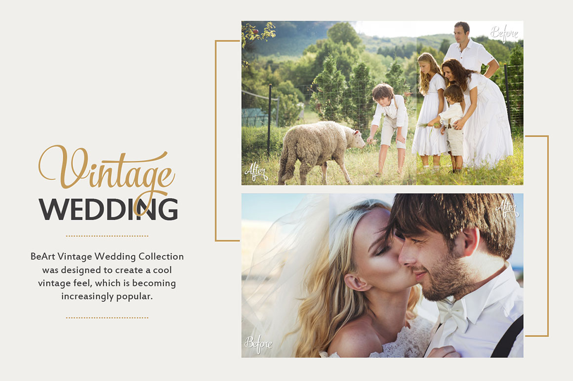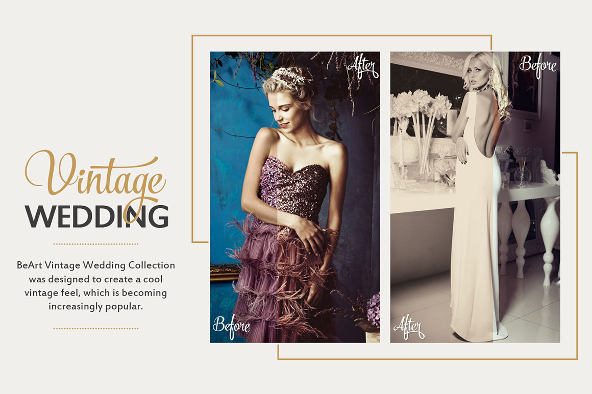 Vintage Wedding Professional Photoshop Actions & ACR Presets Collection includes 30 Premium Photoshop Actions. This is a comprehensive suite of Photoshop Actions, designed to drastically improve workflows for processing and editing wedding photos. With this set you will be able to quickly and easily add a professional finish to your images. This Vintage Wedding Photoshop Actions Collection will help you to create a vintage feel which is becoming increasingly popular with couples, so dabbling in some vintage action can provide you with an attractive addition to your wedding package.
