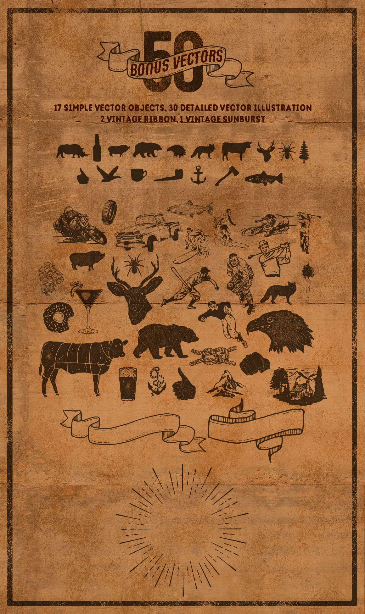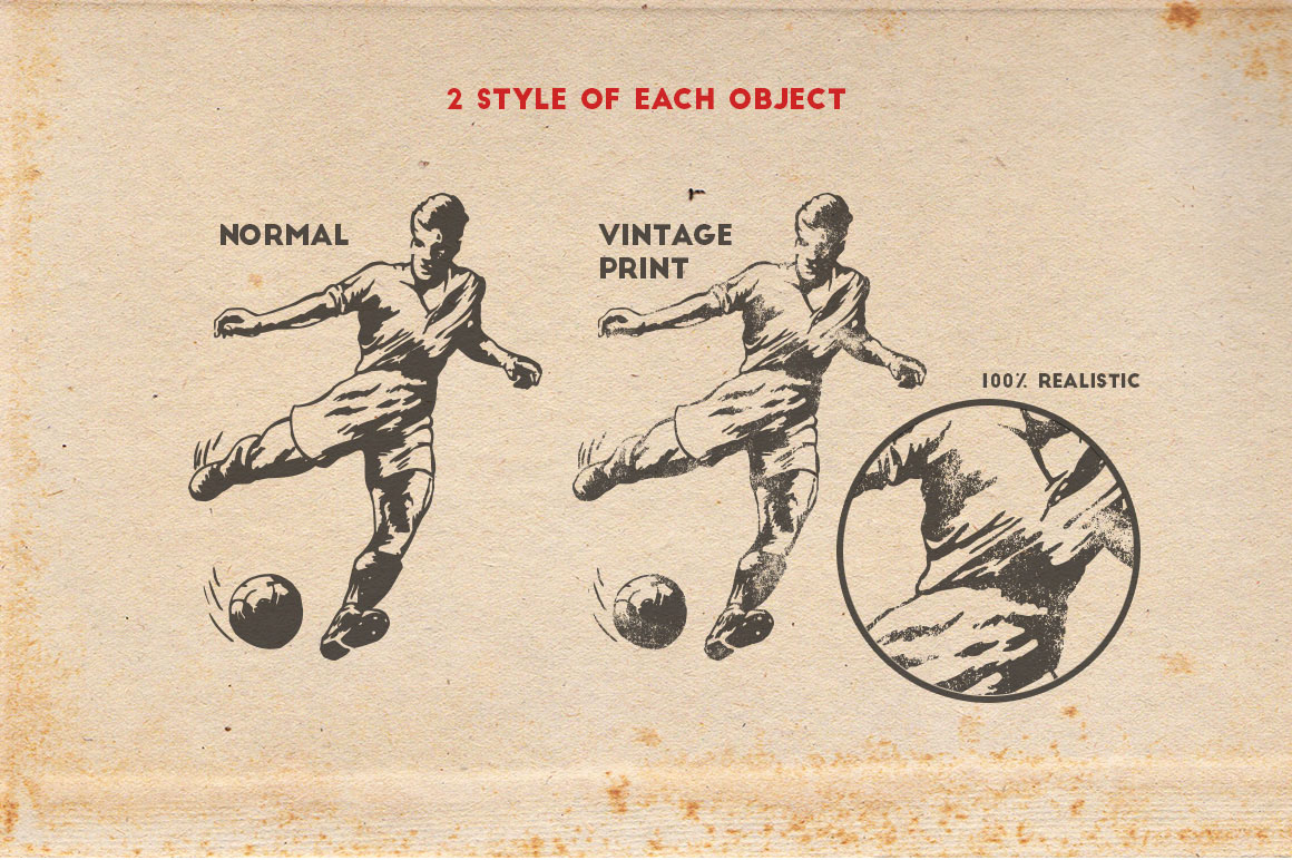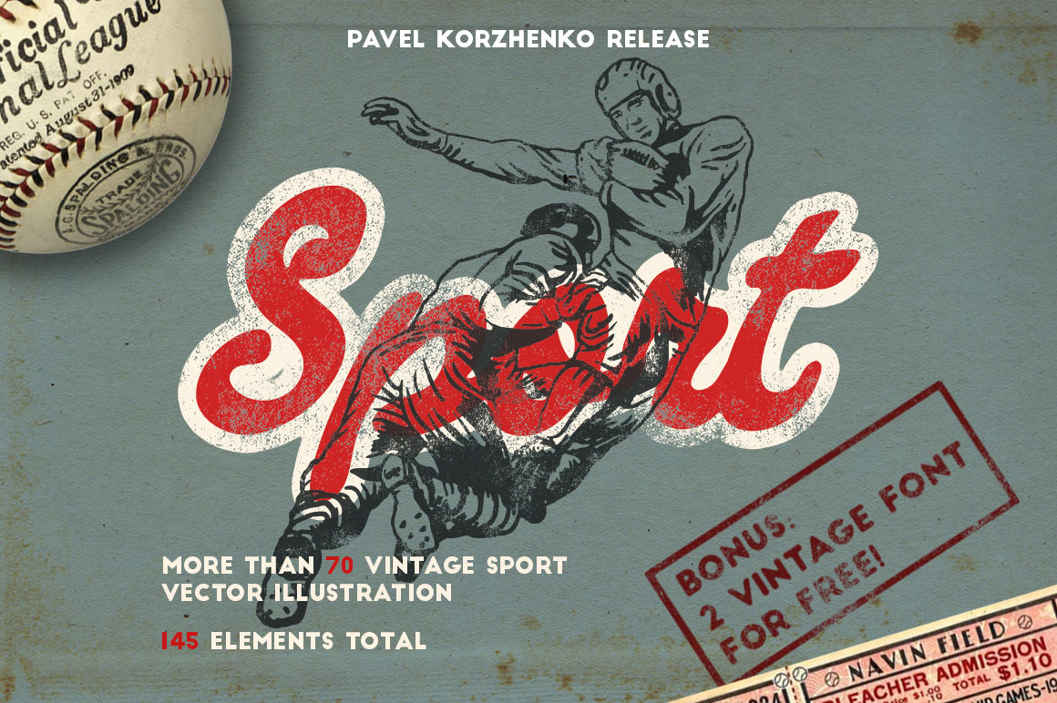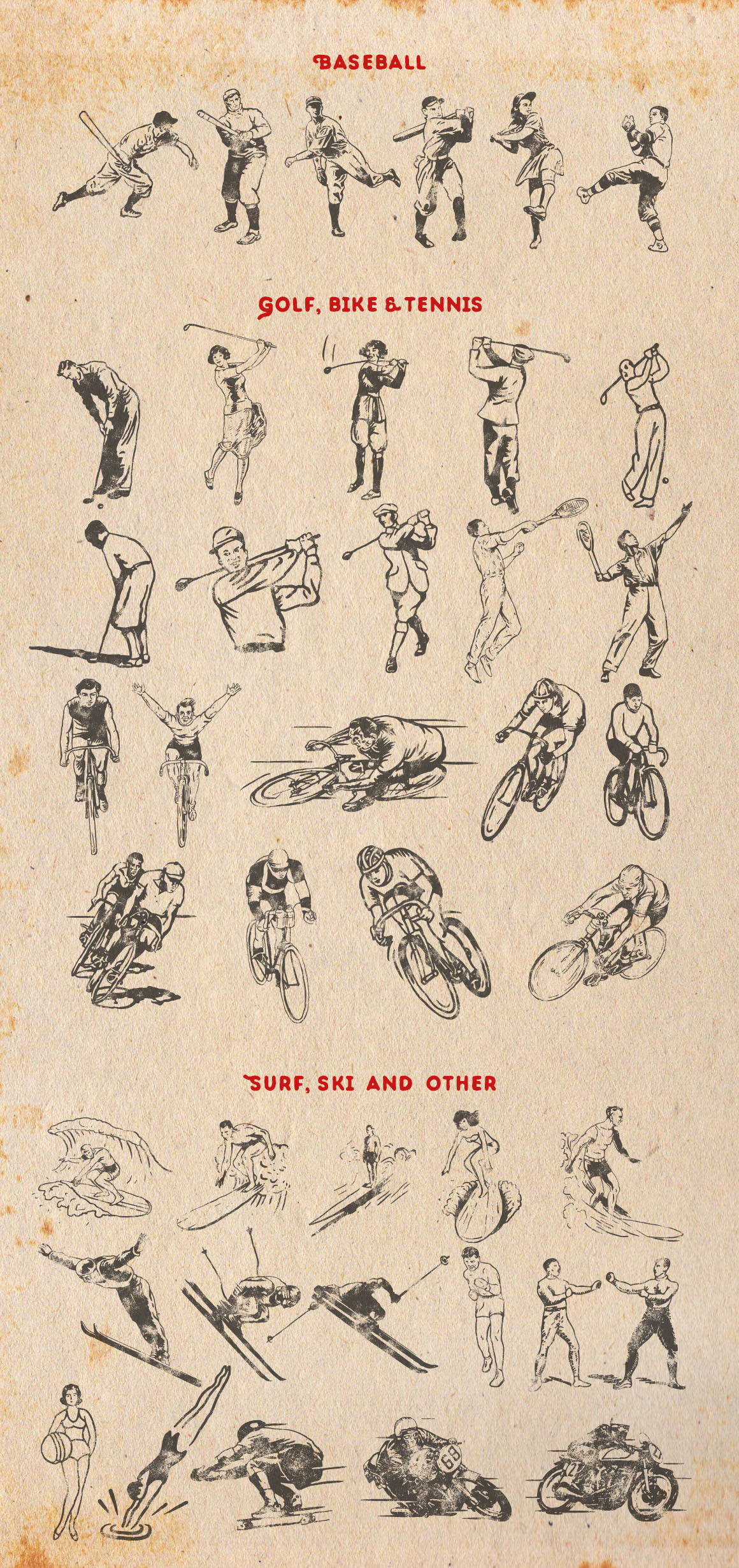 This is a big pack of vintage sport vector illustration. Inspired by vintage magazine cover, cards, posters, tickets and other vintage stuff from 30’s to 80’s. More than 70 individual vector illustration drawn by hand. More than 145 elements total. Different sport theme: american football and rugby, baseball, football, basketball, hockey, golf, bike, tennis, surfing and other. Click to preview pic and scroll down to see all object’s.