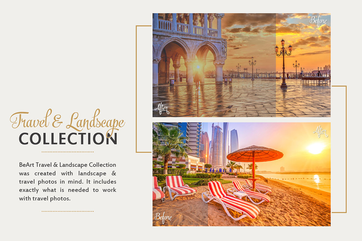 Travel & Landscape Photoshop Actions and Camera RAW Collection, were specially designed to improve workflow for processing and editing travel & landscape images. This collection was created with travel & landscape photos in mind. It includes exactly what is needed to work with travel photos. Landscape & Travel Collection is a MUST HAVE for travel bloggers and travel photographers.