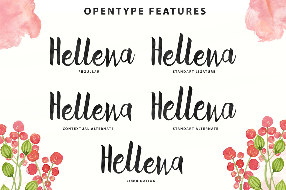 Hellena Script is a beautiful handmade brush script give the natural looks. 238 glyphs and alternate character contain with opentype features. Stylistic alternates, Ornament, Swash and more.You can access all those alternate characters by using OpenType savvy programs such as Adobe Illustrator and Adobe InDesign. Great for Apparel Brand, any greeting cards, book cover, Painting design style, or any design that needs natural and personal touch. Mix and match the alternate characters to add an attractive message to your design.