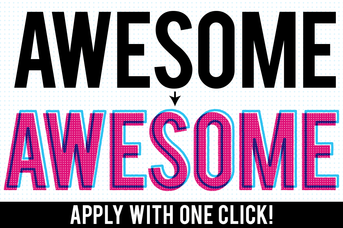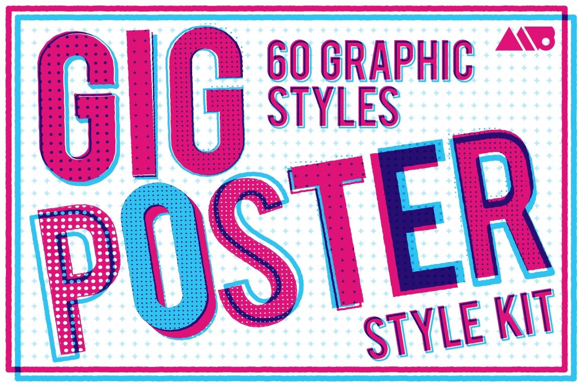 The Gig Poster Style Kit is a set up 60 fully customizable graphic styles for Adobe Illustrator that allow you to apply awesome styles with a single click. A cool side bonus to using these styles on text is that they allow you to keep the type live and fully editable, so you can change and adjust the type as needed without needing to re-apply effects.