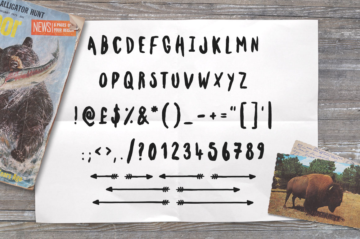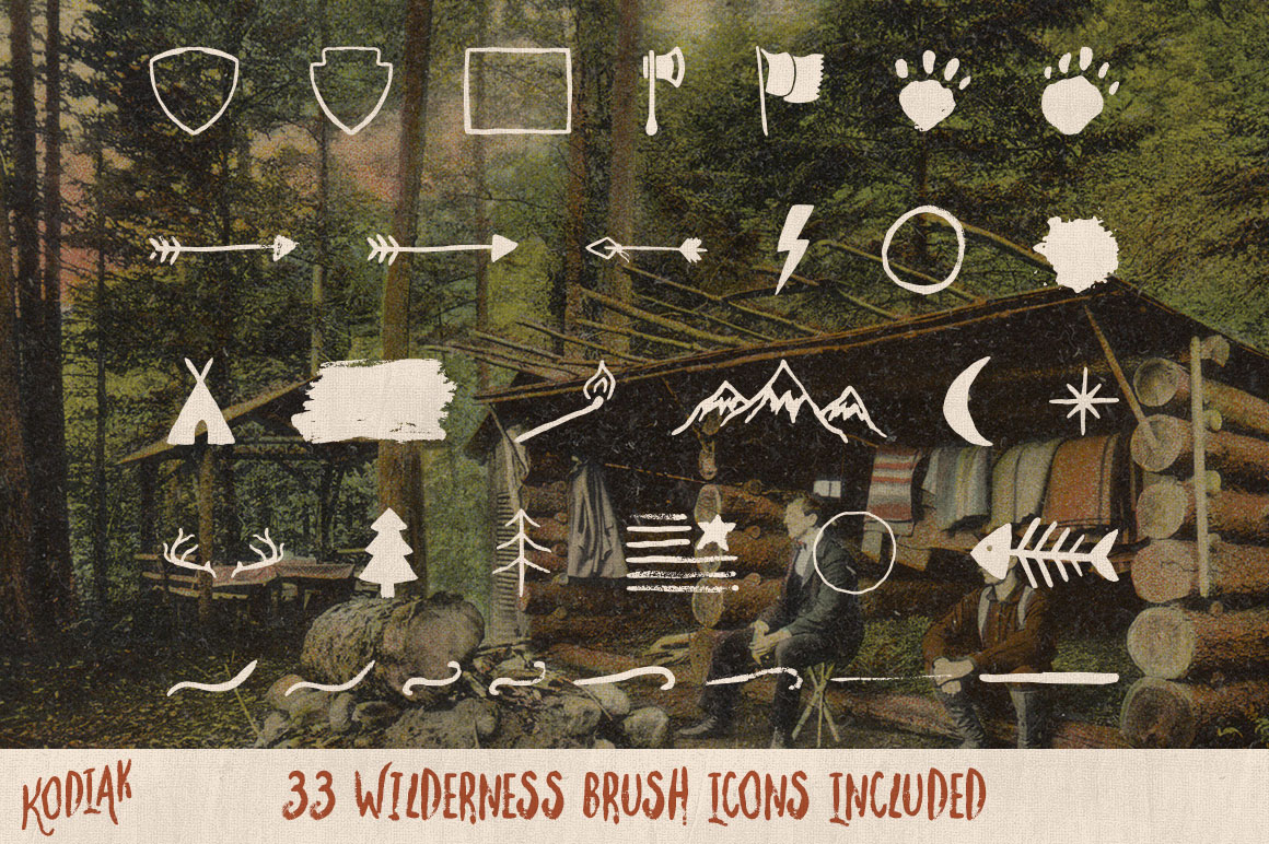 Kodiak is made up of 2 fonts, regular and rough, that reflect the rustic beauty of the wild. A collection of 33 wilderness brush icons are included to compliment Kodiak.