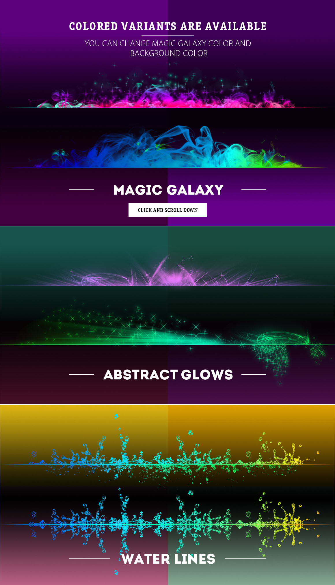 Abstract Glows and water lines are layered .psd files with well named and organized layers. Each layer have different transparent Glow or water imitations, which you can use as independent effect or mix them and create your own one.