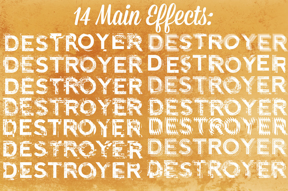 Psd. template which can give you some nice-looking grunge destroying effects useful for any font. Effect is non-destructive and you can on/off effect by one simple click. Perfect for posters, flyers and headlines. 14 initial different effects with endless variations. In psd. file also included 3 colored backgrounds which can give you more realistic grunge effects. Also can be useful for shapes and logos!