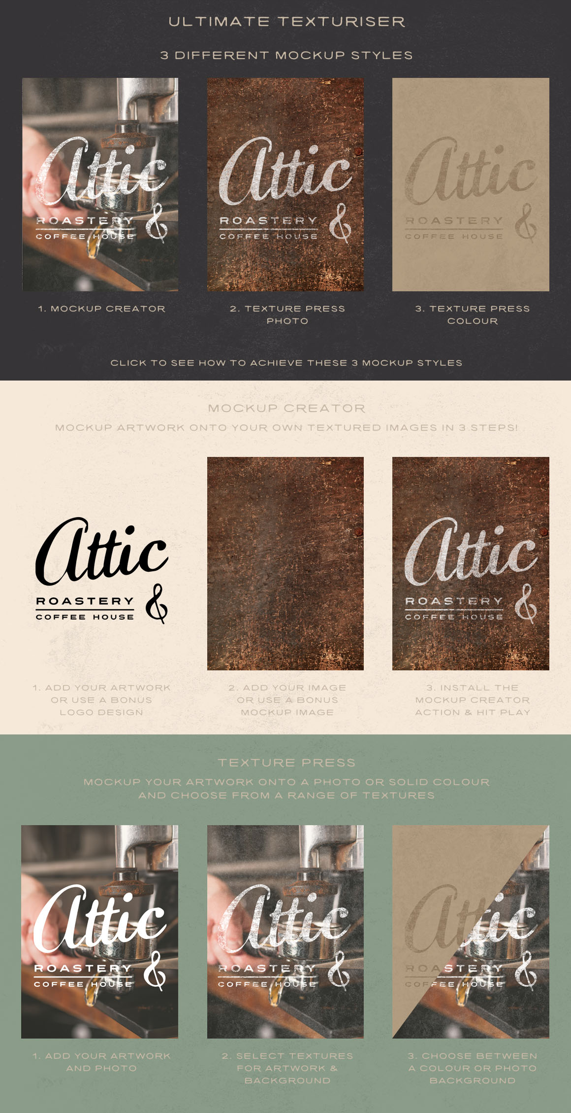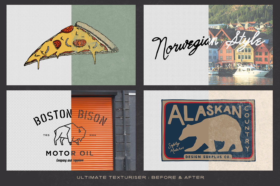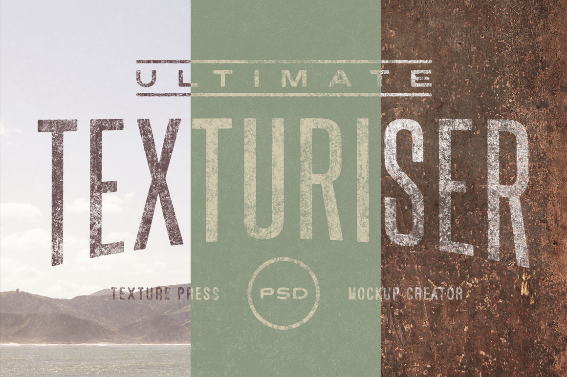 Ultimate Texturiser is a texture press and a custom mockup creator all in one easy to use PSD. You can add realistic worn texture and mockup your artwork in 3 ways: Mockup Creator – Display artwork on your own textured mockup image. One click action and Ultimate Texturiser does the rest! Texture Press – Photo – Display textured artwork over a photo. Texture Press – Colour – Display textured artwork on a solid colour.
