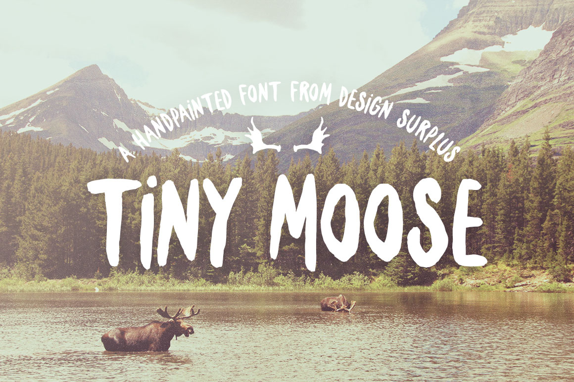 Tiny Moose is the new handcrafted brush font from Design Surplus. Give your artwork a unique personality with this hand painted collection of letters, bonus shields and moose antler icons.