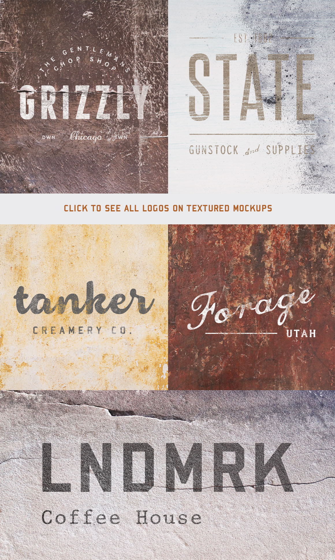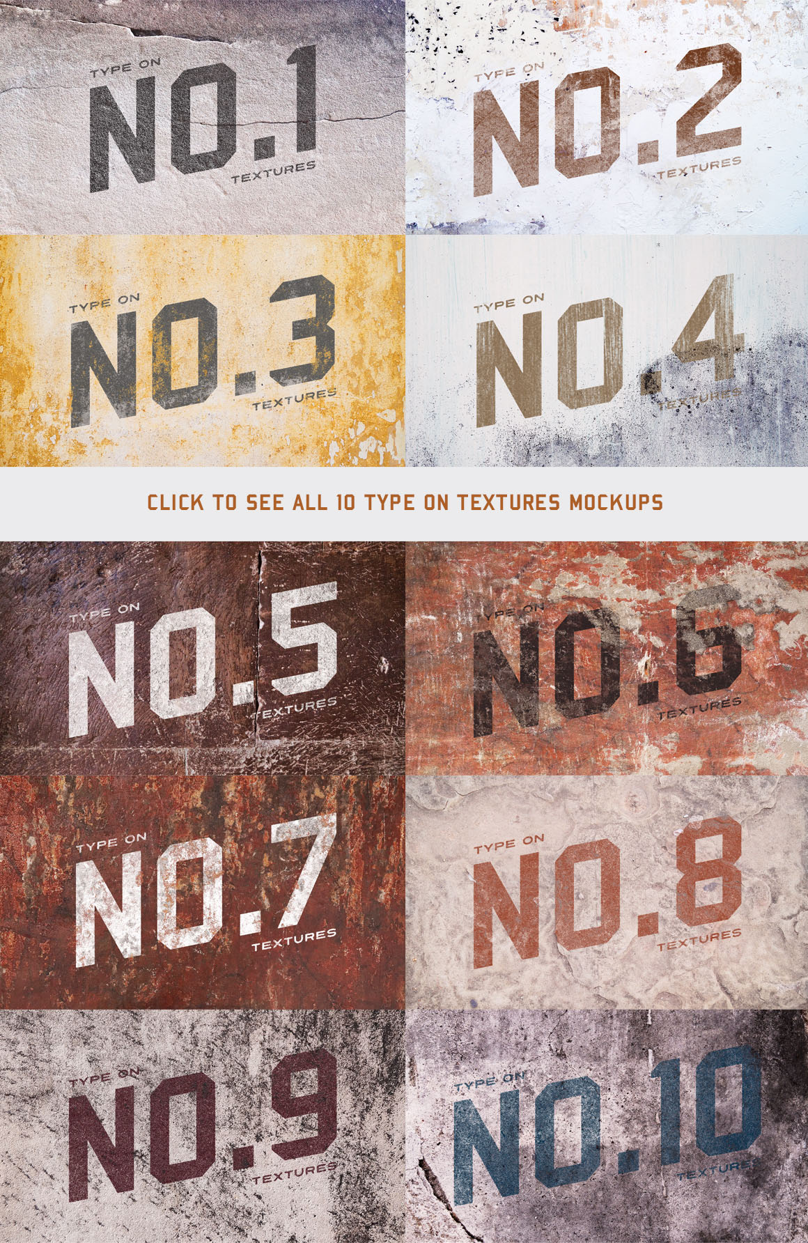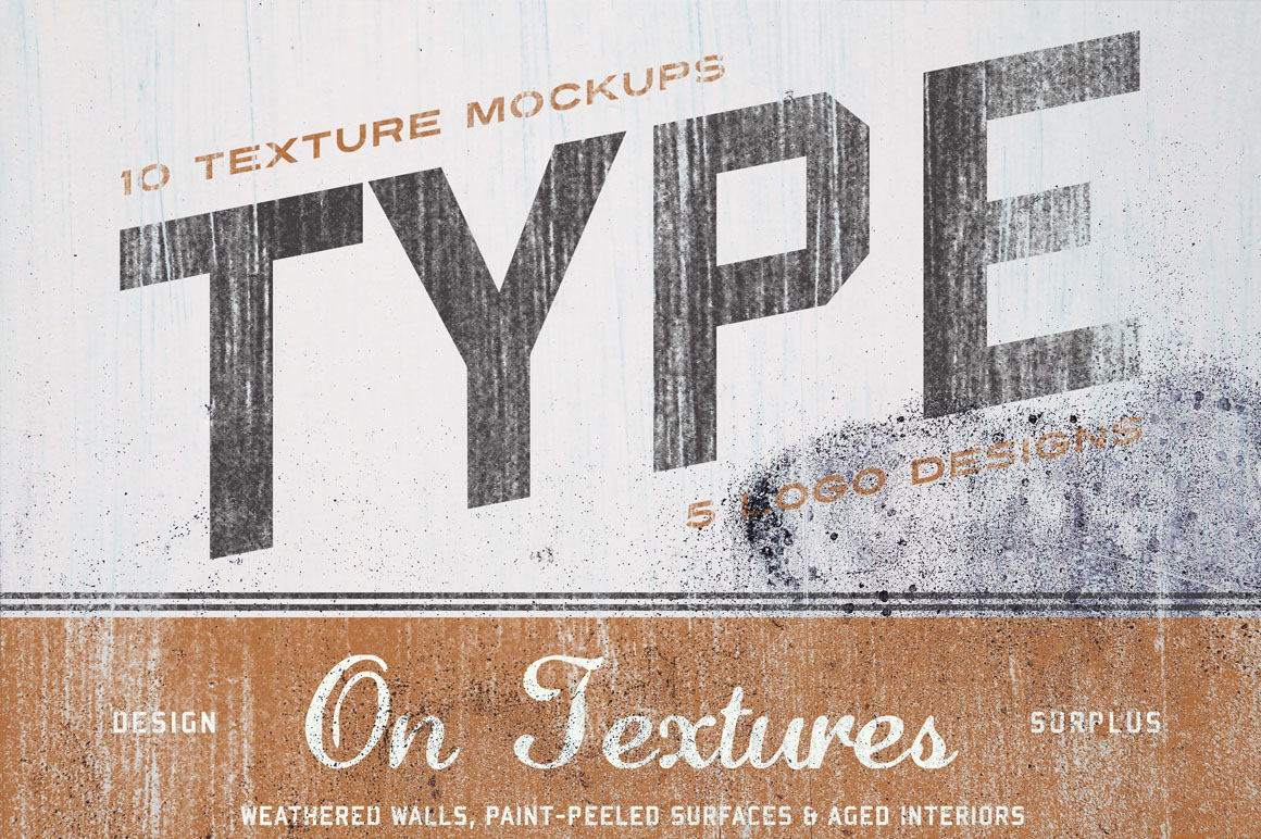 Type On Textures is a collection of 10 mockups found on weathered walls, paint-peeled surfaces and aged interiors. 5 BONUS logos are included to get you creating textured mockups super speedy!