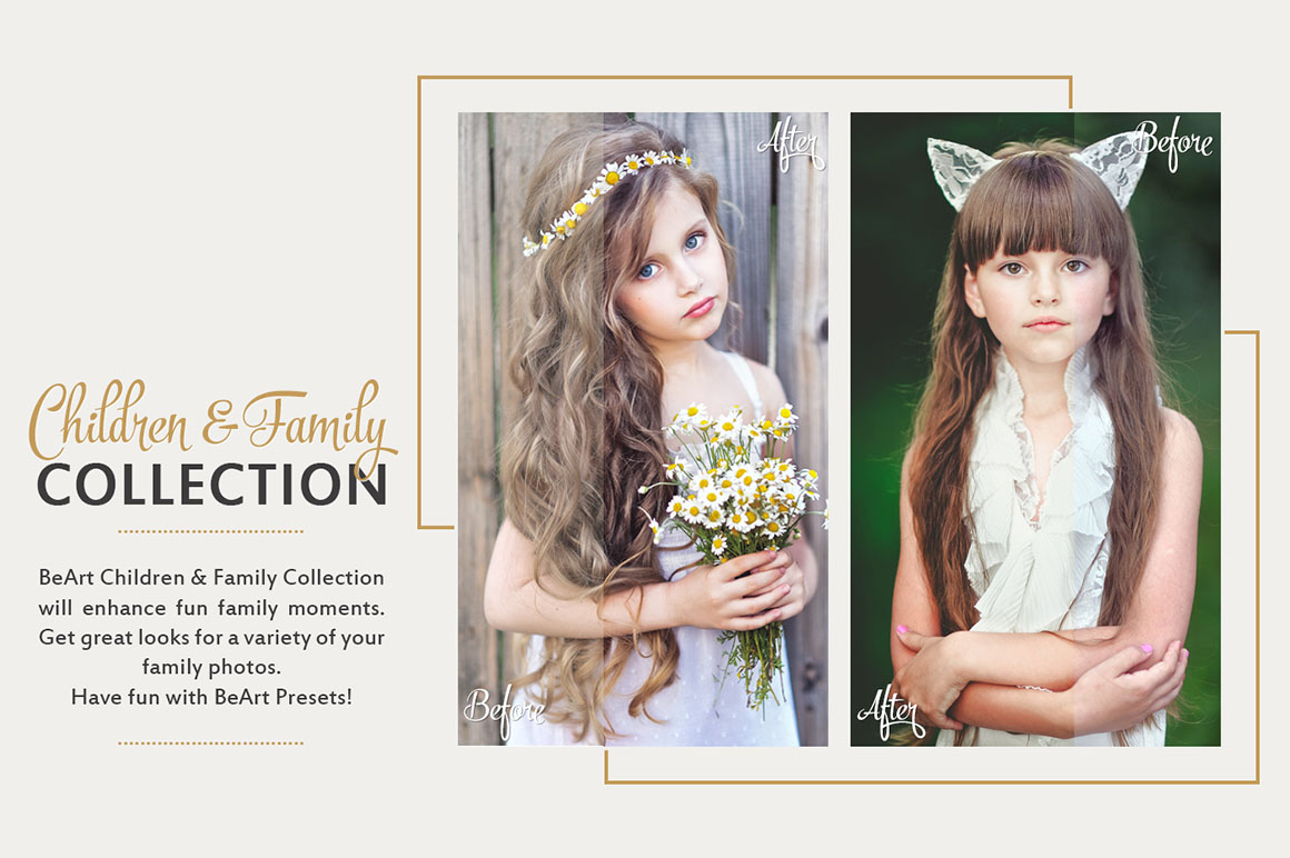 Family & Children BeArt Photoshop Actions Collection will enhance fun family moments and add a professional look to your photos. You’ll find great looks for a variety of your family photos. These Photoshop Actions were designed to give you amazing results in just one click.