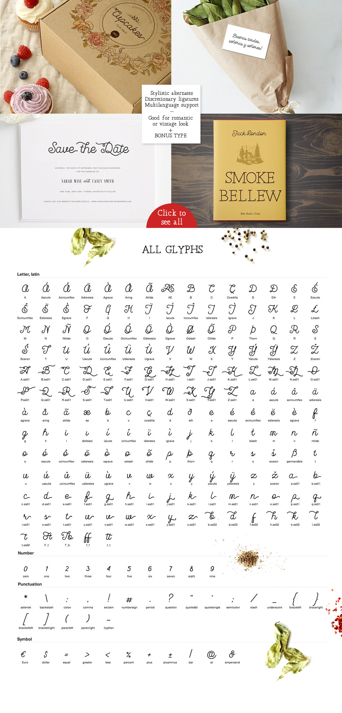 I want to show you my hardworking week product – La Fa Salt cursive script. There are also some interesting alternates ending and other glyphs, discretionary ligatures, includes a full set of capital and lowercase letters (Also with Romantic stylistic alternate), as well as multi-language support, numerals, and punctuation. +BONUS: Robinson. Hand drawn serif free type.