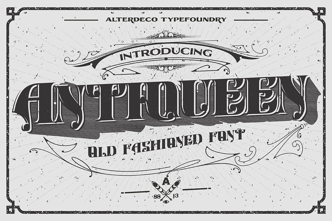 Antiqueen typeface, it’s an old fashioned custom font, inspired by old victorian typographic designs, sign paintings. it’s perfect to create a vintage typography designs, t shirt designs, vintage logotype, etc. it’s come with both ttf and otf version.