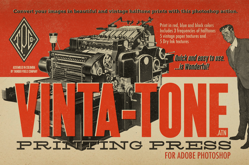 After a few weeks of testing and testing, we obtained a wonderful action for photoshop, Vinta-Tone is a small printing machine of halftones, of course, this is just a visual effect that will bring many memories. In the 30s, 40s and 50s years, the images in newspapers, magazines, books, catalogs and a large number of publications were printed in the famous halftone of a single tone, usually black, but also often use colors like red, blue, green or yellow.