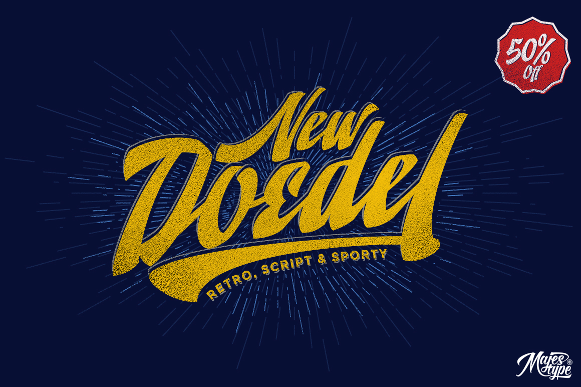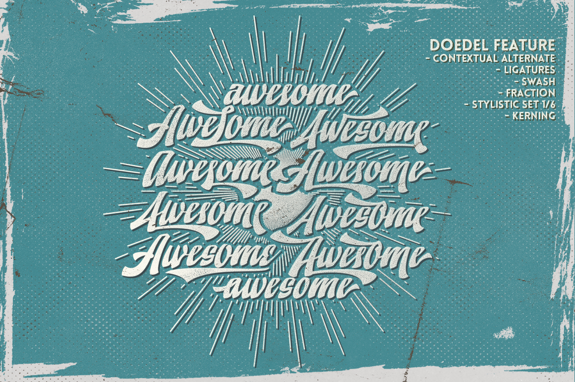 Doedel is a strong script font that comes with over 800 glyphs and is equipped with a host of OpenType features, works well at large size and making it a breeze to customize the feel of your design. An ideal font for retro design, vintage design, t-shirt design, headline, website title, package or etc.