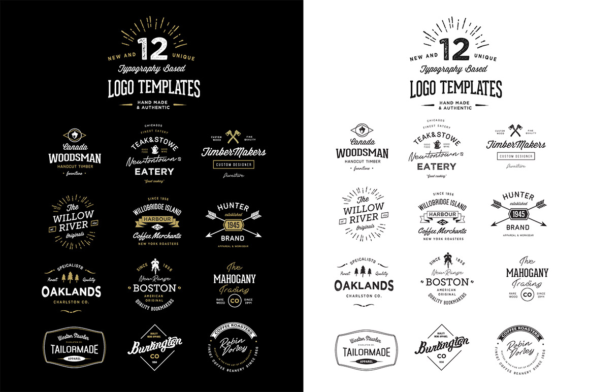 Need some inspiration? A brand new set of Original 12 Typography Based Vintage Logo Templates for use in your next project. These can be used as Logos, Branding, packaging, Apparel Designs, Posters, Stamps, and more.