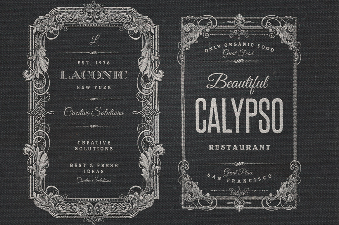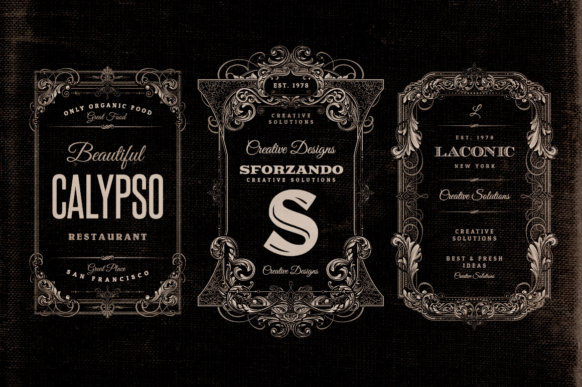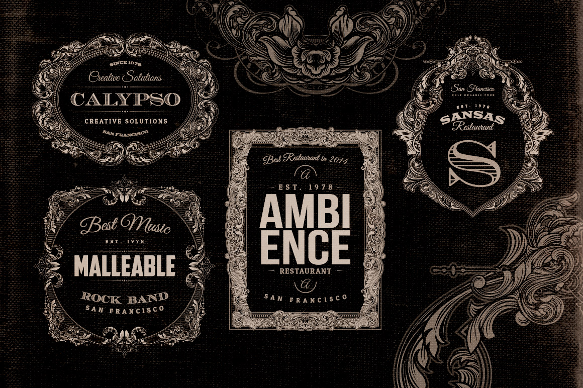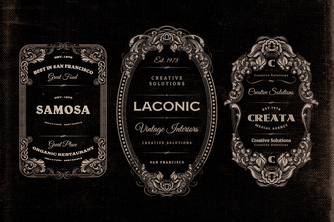 The etching time marked the history of printing in America, especially between the late 19th century and early 20th century. This series of Labels and logos are inspired by this magnificent moment in the history. The elements of “engraved graphic style” at the bottom of each label were taken from books, magazines and catalogs of the era (1800s/1900s) that today are in the public domain. All fonts used are free and you can download and install them before editing a label.