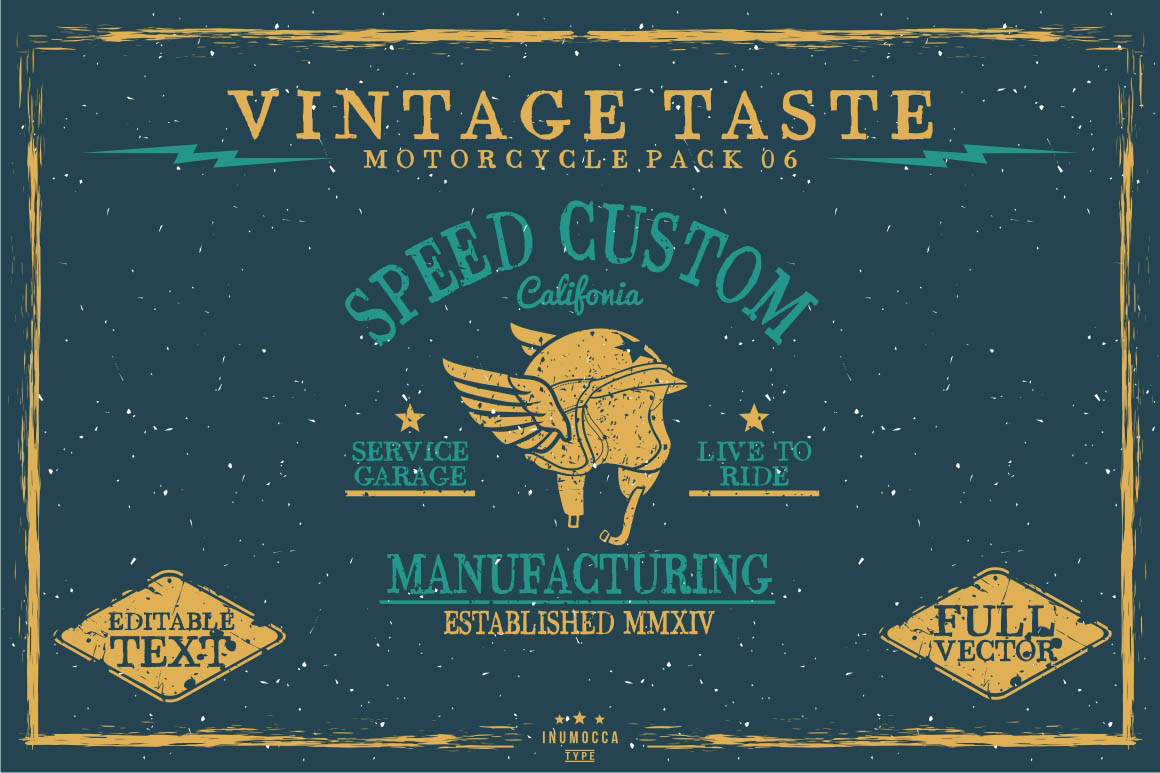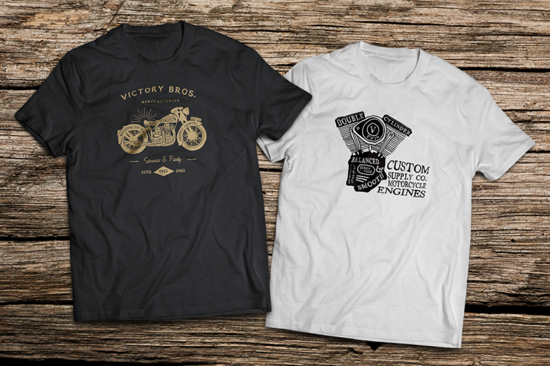 6 Vintage Motorcycle Logo Templates. Inspired by custom hand drawn artists and designers. Each of these logos looks hand drawn, but all the text is actually editable. These would look amazing as a personal logo or retro t-shirt design as shown in one of the screen shots.